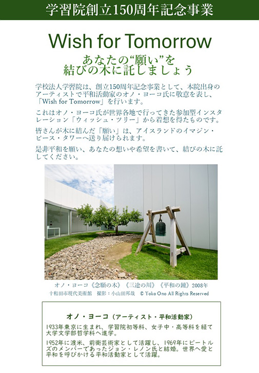 本院で生まれたメッセージも、光の一部として世界へ。私たちの想い、そして学習院が大切にしてきた平和への理念が国境を越えてつながっていく——「Wish for Tomorrow」は、150周年を記念するにふさわしい、雄大でロマンあふれるプロジェクトとなりました。