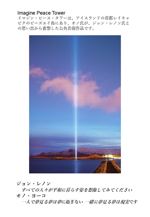 こうして寄せられたメッセージは、後日アイスランド・レイキャビクのビーズエイ島に設置された公共芸術作品「イマジン・ピース・タワー」へ送り届けました。同タワーは、オノ氏が故ジョン・レノン氏を追悼して制作した作品であり、100万を超えるメッセージが保管されています。