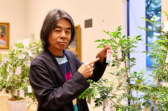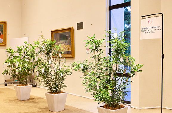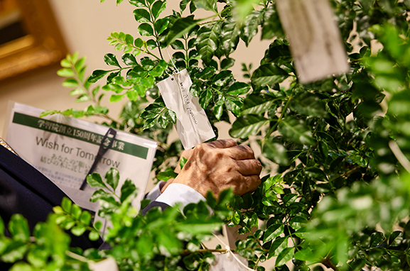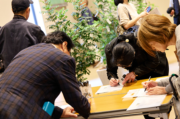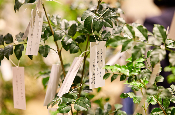この取り組みは、学習院創立150周年第4回記念事業「講演会」にあわせて実施しました。平和への祈りや未来への希望、夢など、それぞれの想いを願い札にしたため、会場に設置された「結びの木」に託しました。願いを文字にし、想いを託す過程を通して、平和について考えを巡らせるひとときとなり、年齢や立場を超えて多くの参加者に静かな共感の広がりが生まれました。