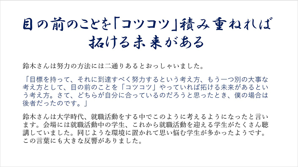 置かれている環境やその時々の心境によって、心に響く言葉は変わってくるはずです。鈴木さん、市川さんの示唆に富んだ多くのアドバイスは、これから先の人生を歩んでいく中で、ふと思い出し、勇気づけられるかもしれません。